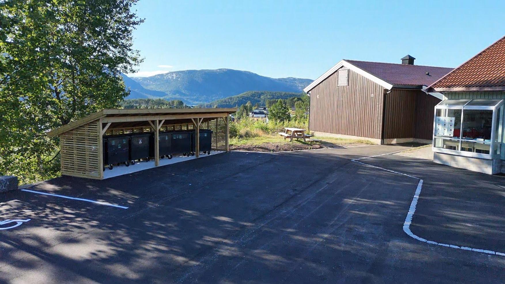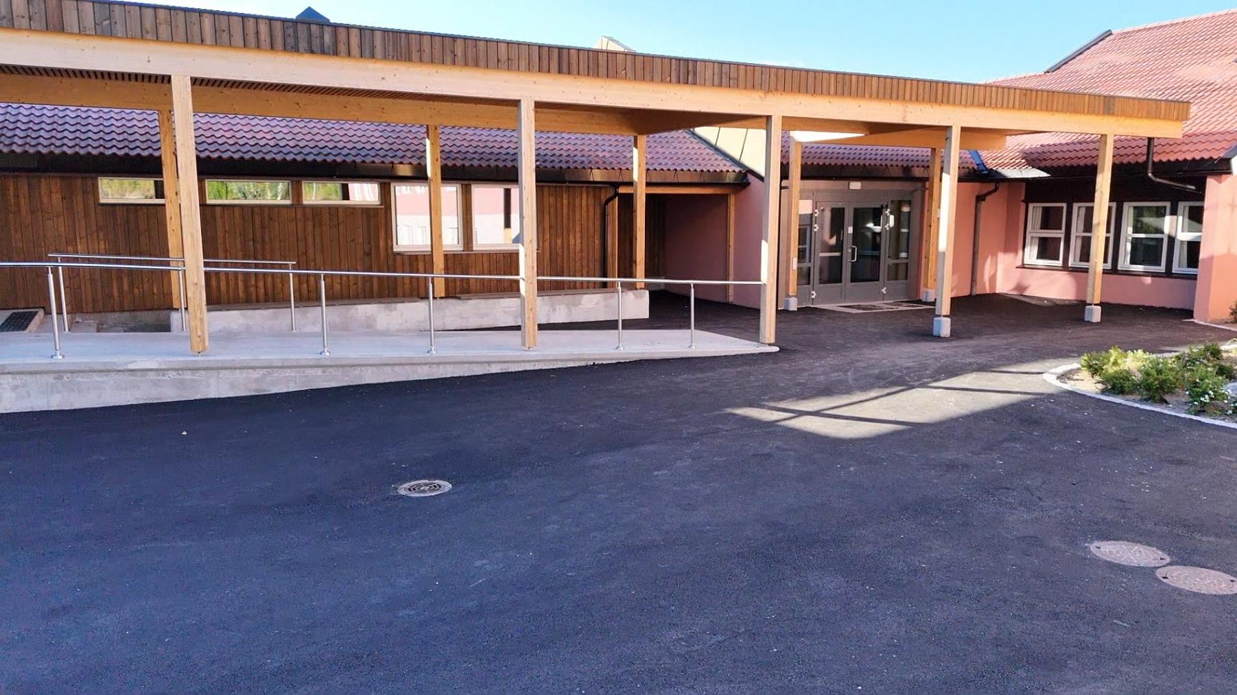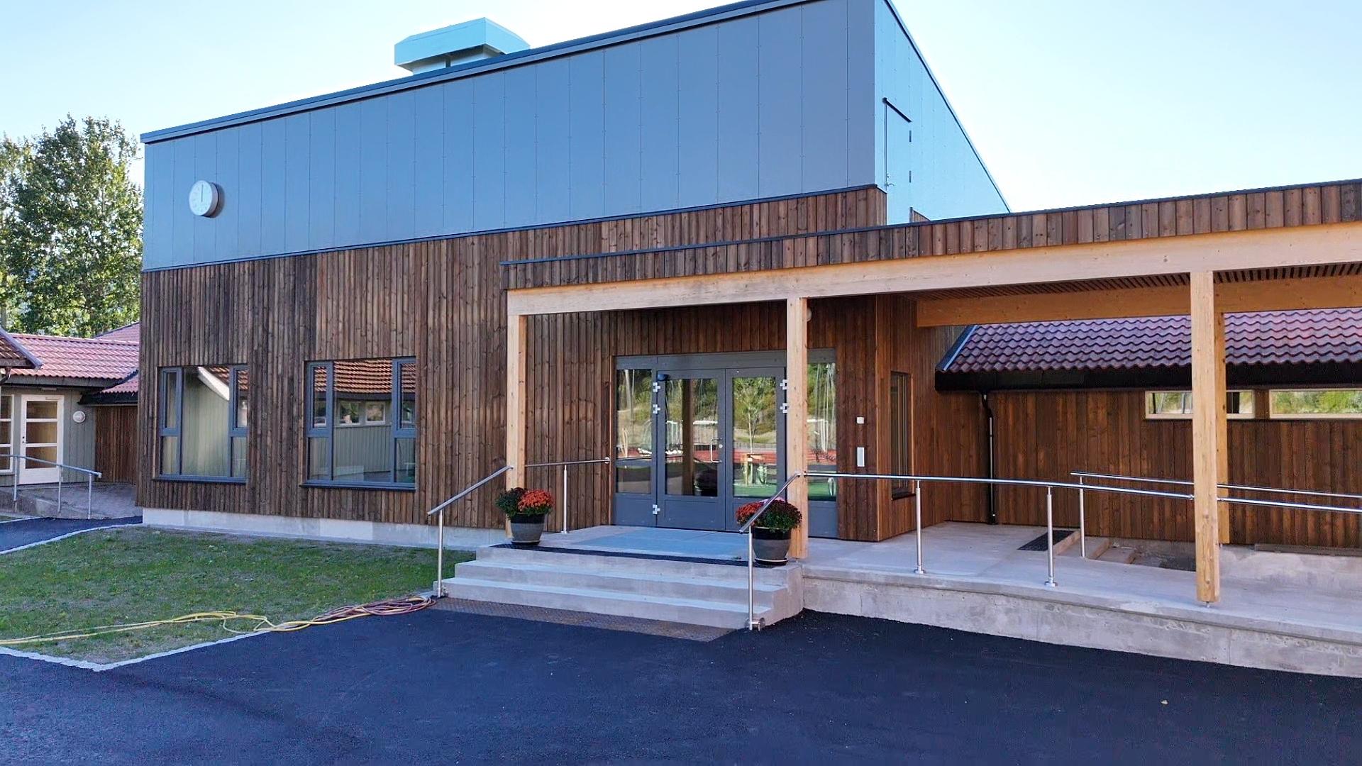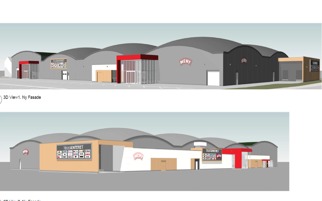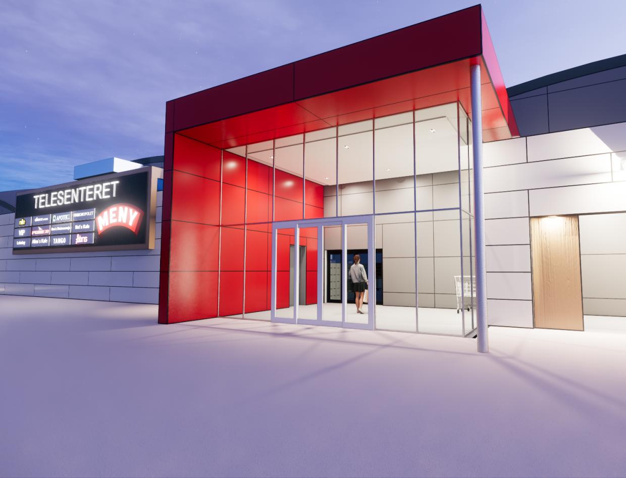 Nye fasader på Telesenteret i Seljord. 4 nye innganger med lager og sykkelparkeringer. Ny utforet vegger med Steniplater på heile fasadene